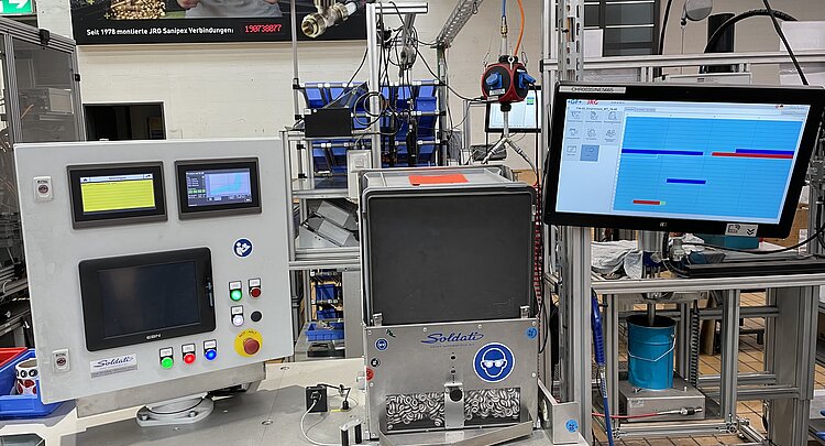 Die flexiPRESS ist mit einem HMI-Bedienpanel ausgestattet, über welches im Einrichtbetrieb neue Adapterstücke geteacht und deren Prozessparameter gespeichert werden können. Die übergeordnete Siemens-Steuerung ruft diese Parameter über Profinet ab und startet den jeweiligen Prozess. Die Ausführung und Auswertung der Pressungen erfolgen in der flexiPRESS-Steuerung, während der aktuelle Status wiederum über Profinet an die Siemens-Steuerung zurückgemeldet wird.